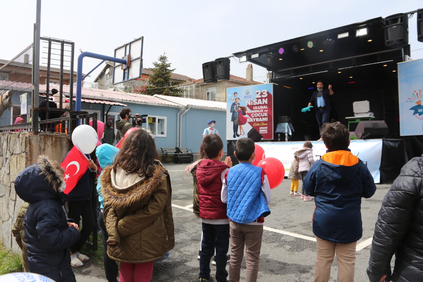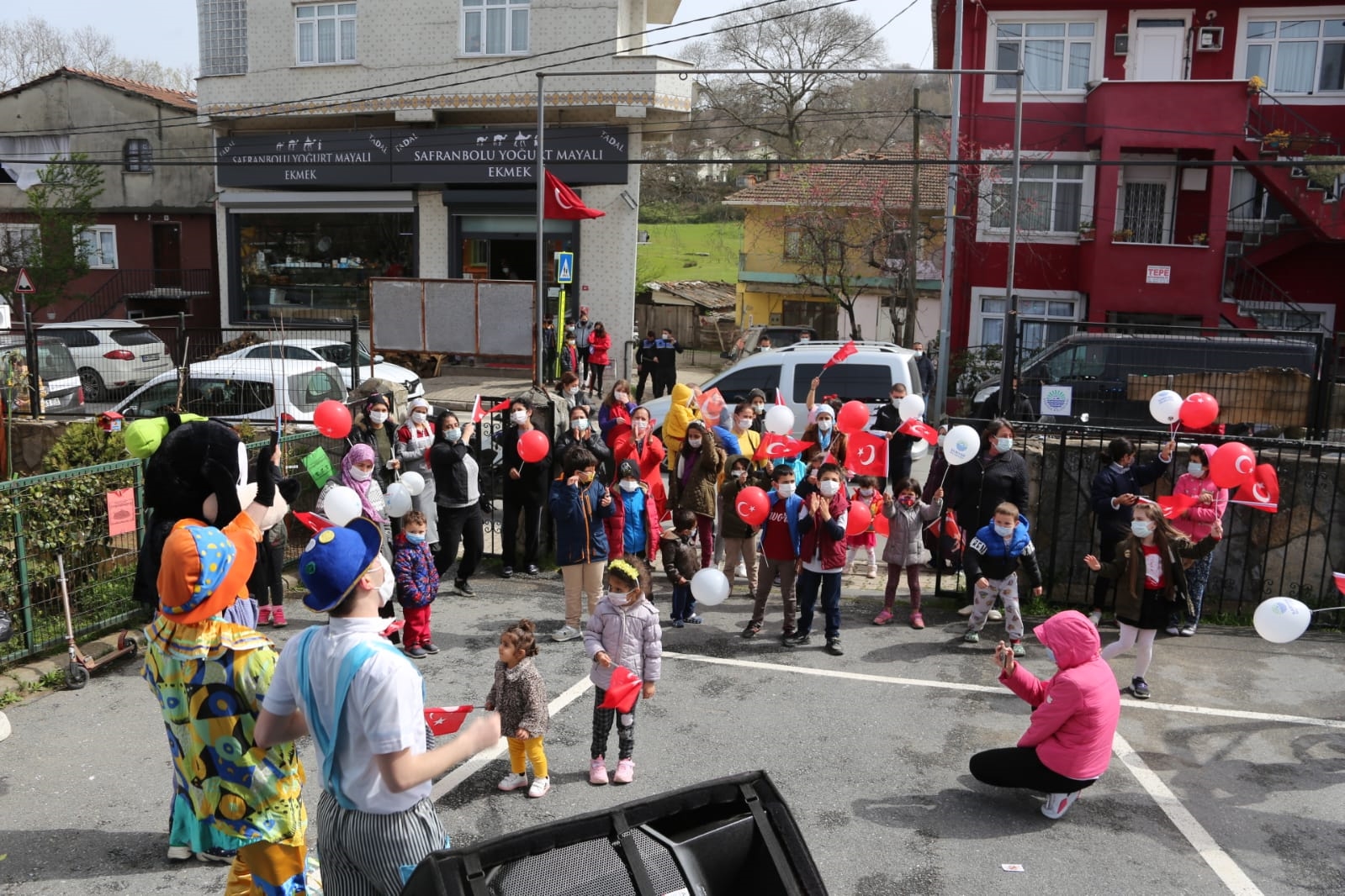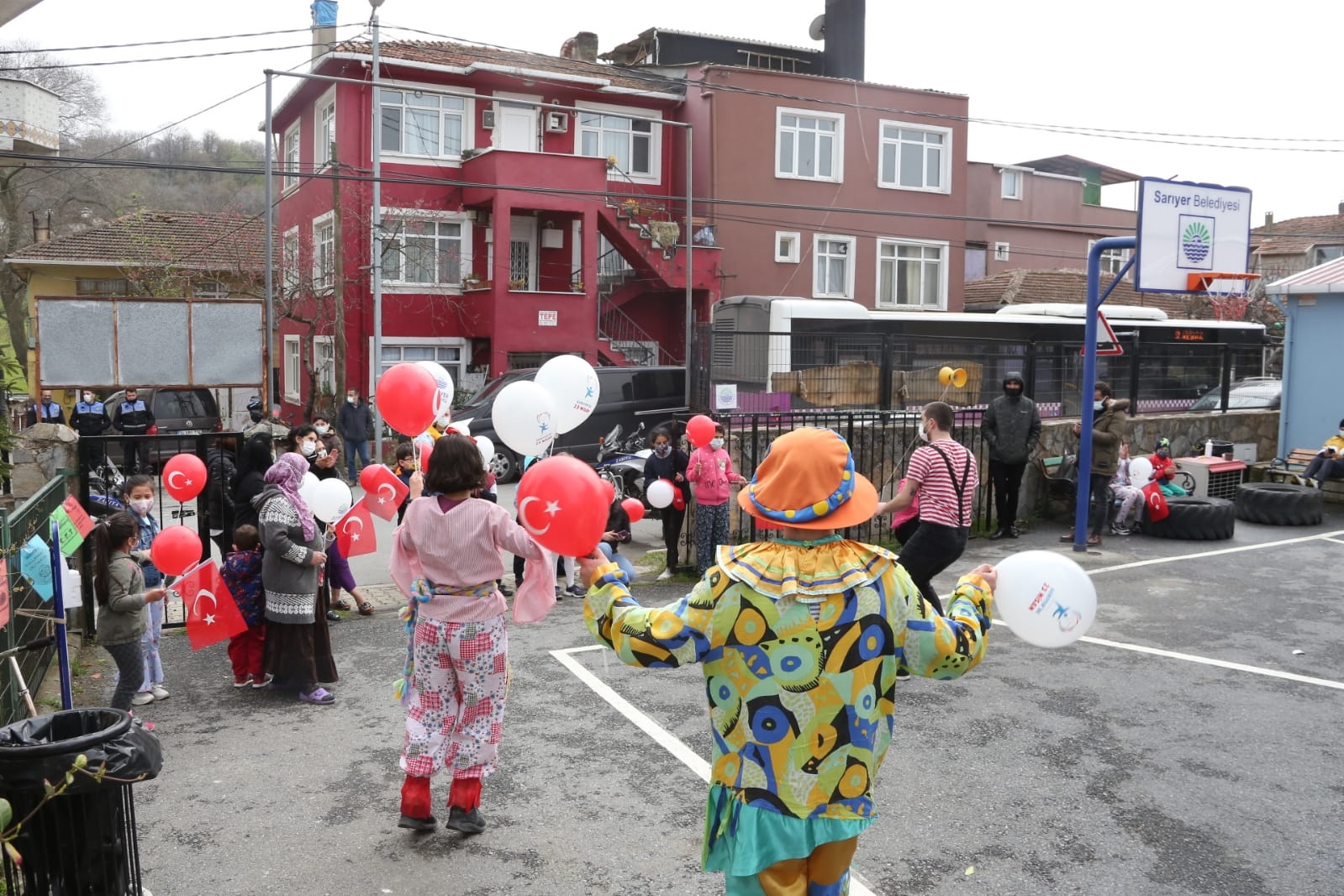 Sarıyer’de bir hafta sürecek 23 Nisan kutlamaları büyük bir coşkuyla başladı. Pandemi koşullarında Sarıyerli çocukların bayram heyecanını doyasıya yaşayabilmeleri için hazırlanan sürpriz tır, şarkılar ve marşlar eşliğinde mahalle mahalle dolaşarak bayrak ve balon dağıttı. Koronavirüs önlemleri kapsamında yapılan etkinlikte, palyaçolar ve animasyon gösterileri de çocuklara unutulmaz anlar yaşattı. 23 Nisan kutlama programında 12 ülke ve 12 şehirden 582 çocuğun halk oyunları performansları da online platformda izleyicisiyle buluşacak.
