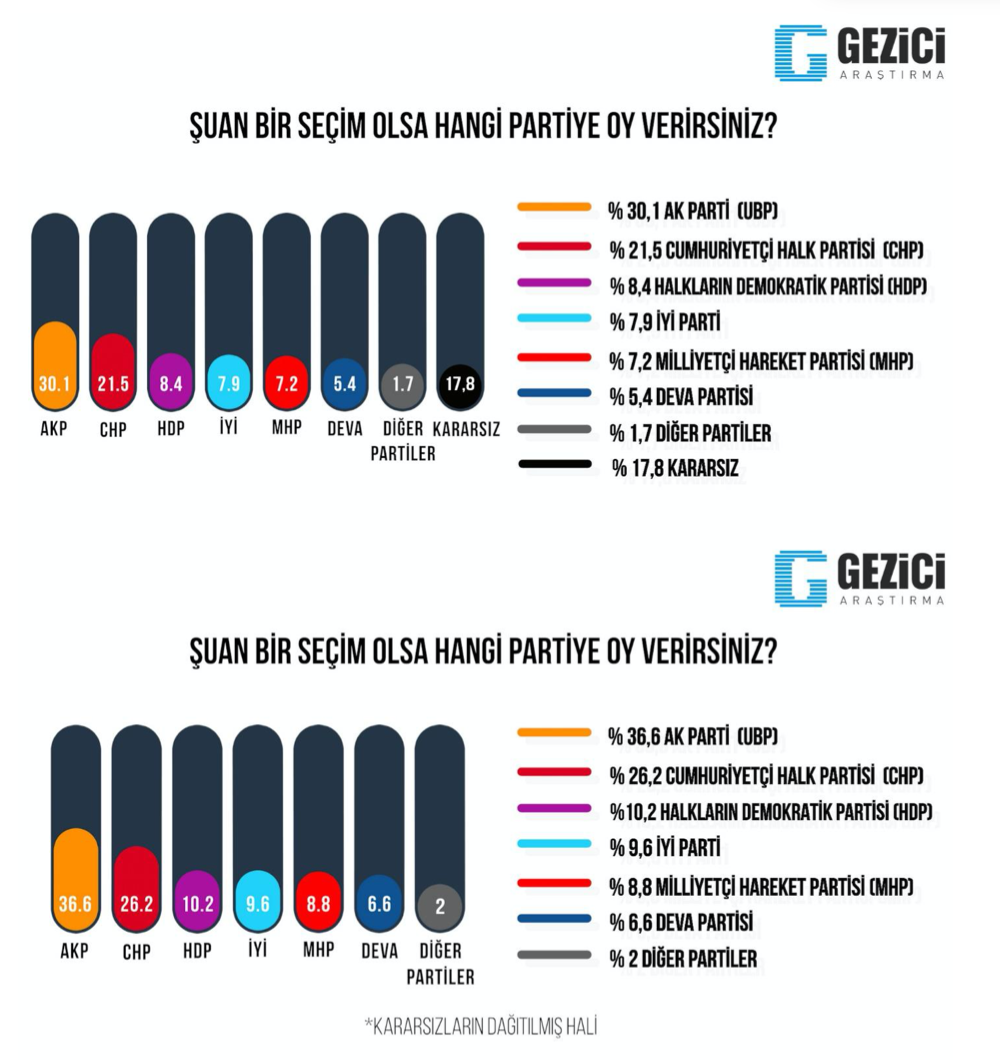 Cumhuriyet’ten Leyla Kılıç’ın haberine göre, Gezici Araştırma Merkezi’nin CHP önüne sunduğu son ankette bugün seçim olsa ittifaksız olarak Meclis’e sadece AKP, CHP ve HDP giriyor.