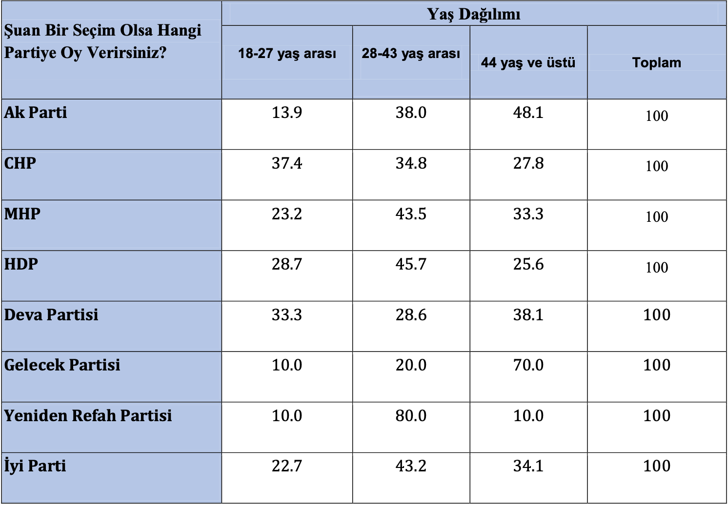AKP’ye oy vereceğini söyleyen kesimin yüzde 48’i, 44 yaş üstünü oluştururken, 18-27 yaş arasında ise AKP sadece yüzde 13,9’luk kesimden oy alıyor. 18-27 yaş arasındaki seçmenlerden yüzde 37,4 CHP’ye oy vereceğini söylerken, onu yüzde 33,3 ile DEVA Partisi izliyor.