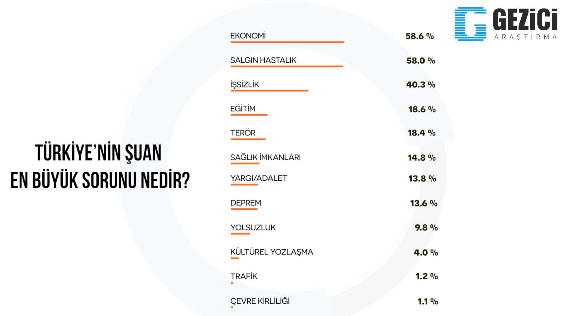 Anket sonuçlarını değerlendiren Gezici Araştırma Merkezi Başkanı ve Uluslararası Güvenlik ve Stratejik Çalışmalar Uzmanı Murat Gezici ise seçimin seyrini ekonominin belirleyeceğini söyledi. Yurttaşların gelecek ile kaygıları bulunduğunu belirten Gezici, “Seçmen kitlesinin büyük bir bölümü, ekonomik sorunlar yaşıyor. Gelecek ile ilgili kaygılar, umutsuzluklar, hayal kırıklıkları taşıyor. Seçmenler nezdinde ekonominin alarm vermesi, onların mevcut hükümetin izlediği ekonomi politikasına eleştirel bir şekilde bakmasına neden oluyor. Dolayısıyla bugün seçmen nezdinde AKP hükümetinin ekonomi ile ilgili izlediği politikalar kırık not almış gibi görünüyor” dedi.