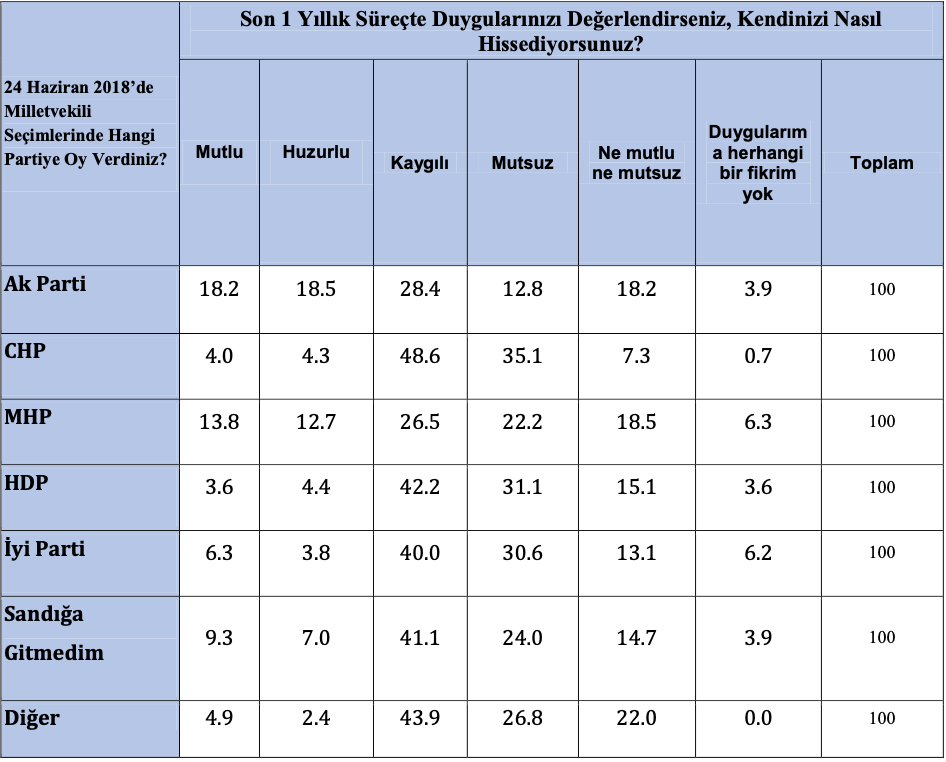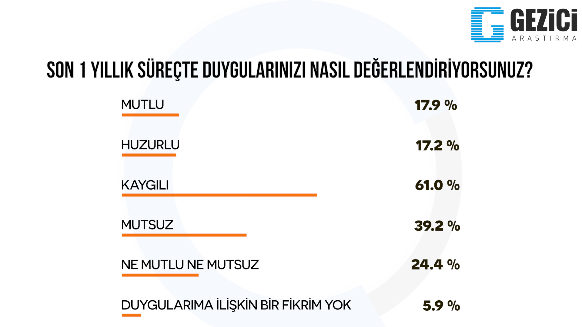 İktidar ve muhalefet seçmeninin de mutsuz olduğunu söyleyen Gezici, “MHP seçmeninin yüzde 22,2’si mutsuz ve yüzde 26,5’i kaygılı iken AKP seçmeninin yüzde 12.8’i mutsuz, yüzde 28.4’ü ise kaygılı. Bu anlamda MHP seçmeni ile AKP seçmeninin yarısına yakınının duygu durumu mutsuzluk ve kaygılılık ekseninde. Mutsuzluk ve kaygılılık hali, iktidar seçmeni ile muhalefet seçmeni arasında paylaşılan ortak havuzlardan biri haline geldi. Meclis’te ortak noktada buluşamayan muhalefetteki partiler sokakta halkla ortak değerler üzerinden bir araya gelmeye başladılar. Sorunlara birlikte eğiliyorlar. Sahada aynı dili konuşan ve tek kadrodan oluşan muhalefet kanadı görüyoruz” dedi.