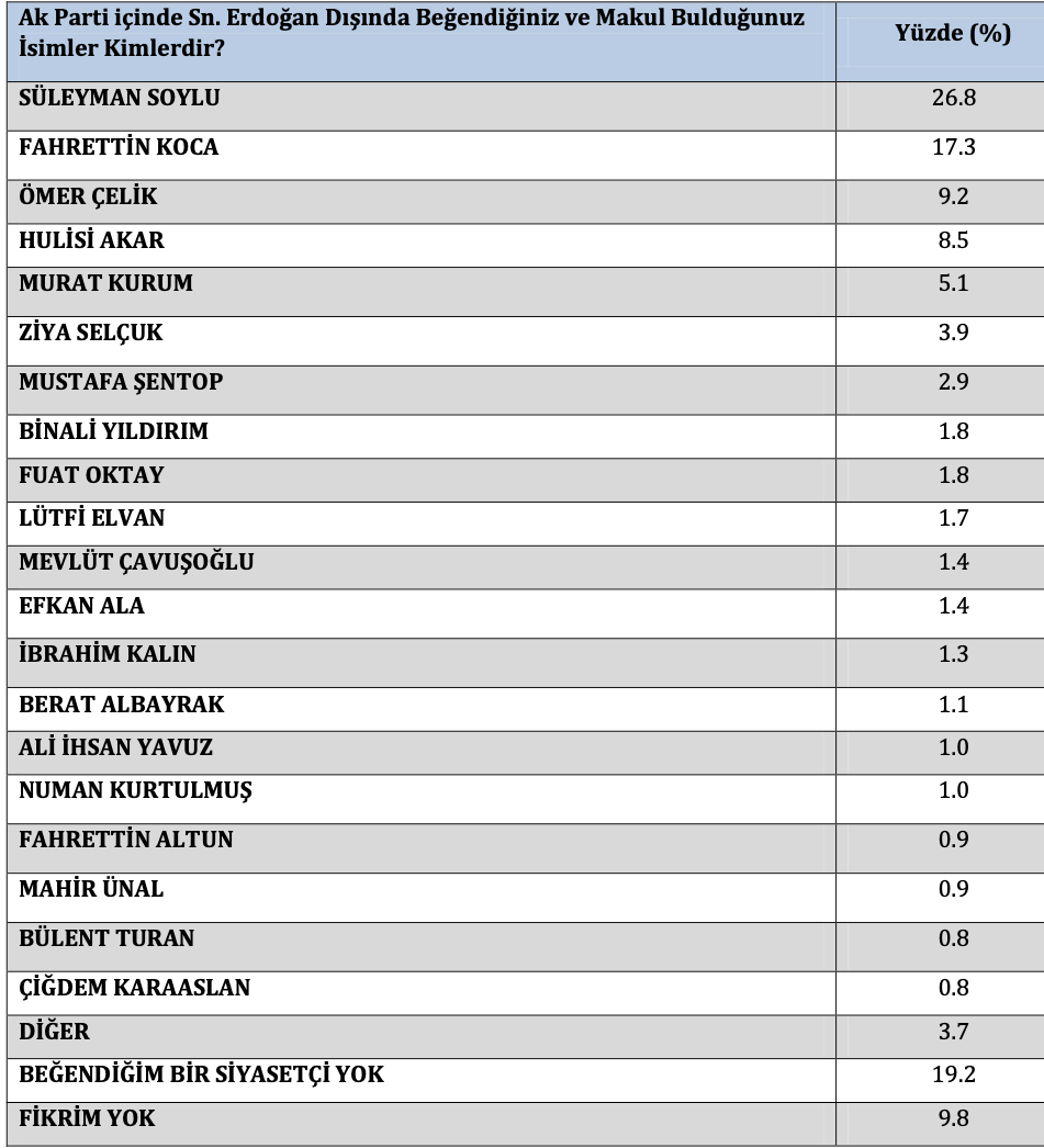 Ankete katılanlara AKP, CHP, MHP ve İYİ Parti’de mevcut liderlerden sonra beğenilen isimler soruldu. AKP içerisinde Erdoğan’dan sonra en beğenilen isim yüzde 26,8 ile Süleyman Soylu oldu. Onu sırasıyla Fahrettin Koca, Ömer Çelik, Hulusi Akar, Murat Kurum, Ziya Selçuk, Mustafa Şentop, Binali Yıldırım, Fuat Oktay, Lütfi Elvan, Mevlüt Çavuşoğlu, Efkan Ala, İbrahim Kalın, Berat Albayrak, Ali İhsan Yavuz, Numan Kurtulmuş, Fahrettin Altun, Mahir Ünal, Bülent Turan, Çiğdem Karaaslan takip etti.