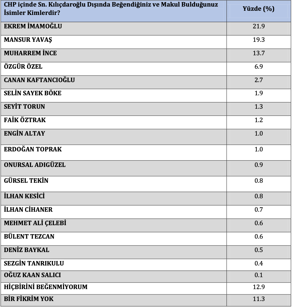 CHP’de ise Kemal Kılıçdaroğlu’nun ardından ikinci sırada yüzde 21,9 ile Ekrem İmamoğlu yer alıyor. İmamoğlu’nu ise sırasıyla Mansur Yavaş, Muharrem İnce, Özgür Özel, Canan Kaftancıoğlu, Selin Sayek Böke, Seyit Torun, Faik Öztrak, Engin Altay, Erdoğan Toprak, Onursal Adıgüzel, Gürsel Tekin, İlhan Kesici, İlhan Cihaner, Mehmet Ali Çelebi, Bülent Tezcan, Deniz Baykal, Sezgin Tanrıkulu, Oğuz Kaan Salıcı izliyor.