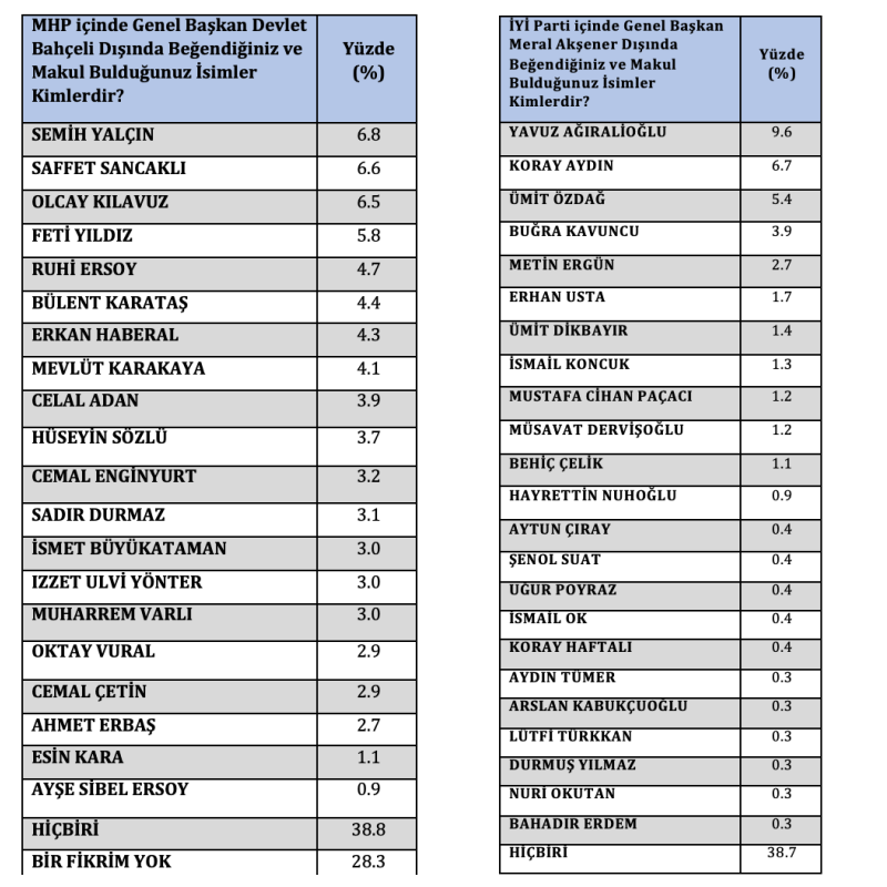 MHP’de ise Devlet Bahçeli’den sonra beğenilen isimler arasında Semih Yalçın, Saffet Sancaklı, Olcay Kılavuz, Feti Yıldız, Ruhi Ersoy, Bülent Karataş, Erkan Haberal, Mevlüt Karakaya, Celal Adan, Hüseyin Sözlü, Cemal Enginyurt, Sadır Durmaz, İsmet Büyükataman, İzzet Ulvi Yönter, Muharrem Varlı, Oktay Vural, Cemal Çetin, Ahmet Erbaş, Esin Kara, Ayşe Sibel Ersoy bulunuyor. İYİ Parti’de Meral Akşener’den sonra Yavuz Ağıralioğlu, Koray Aydın, Ümit Özdağ, Buğra Kavuncu, Metin Ergün, Erhan Usta, Ümit Dikbayır, İsmail Koncuk, Mustafa Cihan Paçacı, Müsavat Dervişoğlu, Behiç Çelik, Hayrettin Nuhoğlu, Aytun Çıray, Şenol Suat, Uğur Poyraz, İsmail Ok, Koray Haftalı, Aydın Tümer, Arslan Kabukçuoğlu, Lütfü Türkkan, Durmuş Yılmaz, Nuri Okutan, Bahadır Erdem isimleri makul bulunuyor.