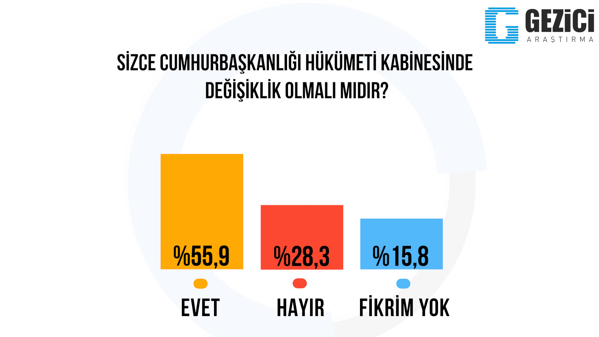 Ankete göre Erdoğan ile kabinesi arasında bir boşluk olduğunu kaydeden Gezici, “Kabine için Erdoğan’dan kopuk, onun beklentilerine ve vizyonuna uyumlu olmadığı düşüncesi ön plana çıkıyor. Seçmen, Erdoğan’a onay verirken, mevcut kabinesine onay vermiyor. Bu durum hükümete yönelik bir kabine değişikliğine dair önemli ipuçları sağlıyor” ifadelerini kullandı.
