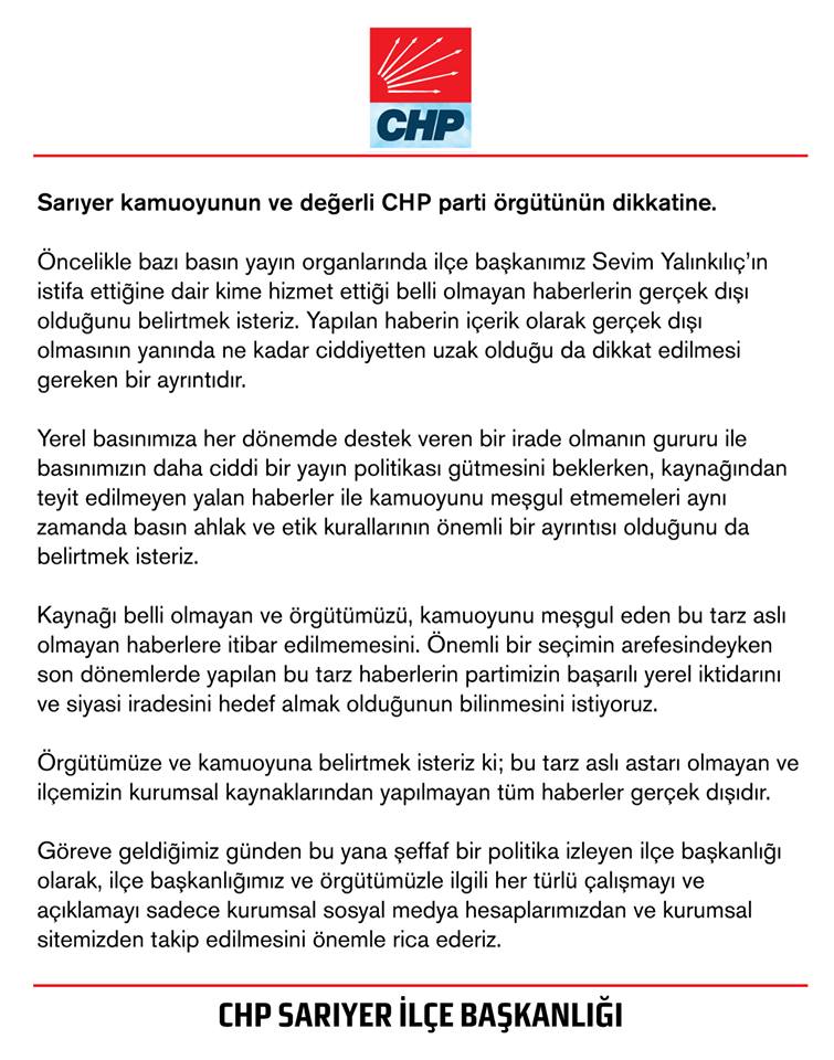 CHP Genel Merkezi ve CHP Sarıyer İlçesi “Yerel Seçimler Genelgesi” gereği Yönetim Kurulu istifa süreci tamamlanmış. takvim süreci dolmuştur.