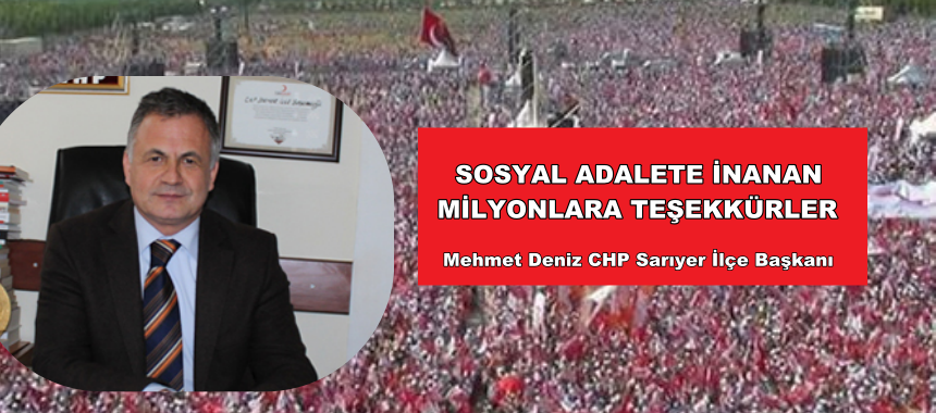 CHP Sarıyer İlçe Başkanı Mehmet Deniz sosyal medyadan yapmış olduğu teşekkür mesajında “Sosyal adalete inanan milyonlara teşekkür ederim dedi.