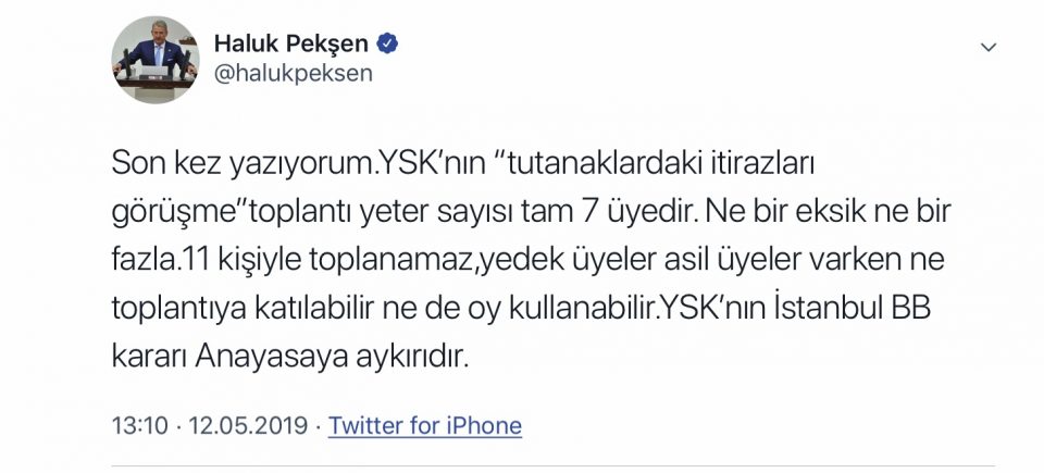 CHP Millet Vekilli Haluk Pekşen sosyal medya hesabından paylaştığı duyuruda, YSK’nın İstanbul BB Kararı Anayasaya aykırı olduğunu belirtti.