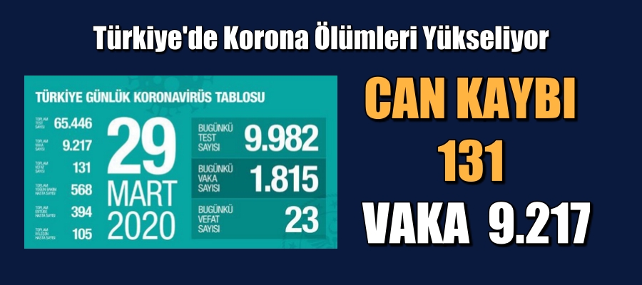Türkiye koronavirüs sonuçları kötü işaretler gösteriyor. Bakan Koca, 23 kişinin daha hayatını kaybettiğini, bugünkü vaka sayısının ise bin 815 olduğunu söyledi. Yapılan bu açıklamanın ardından toplam vaka sayısı 9 bin 217’ye, hayatını kaybedenlerin sayısı ise 131’e yükselmiş oldu.