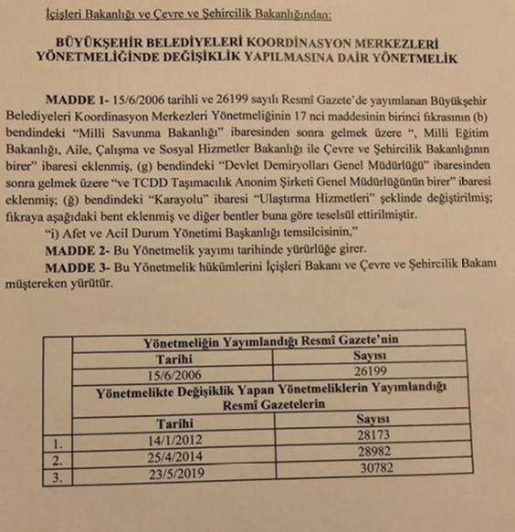 Bugün Resmi Gazete’de, “Büyükşehir Belediyeleri Koordinasyon Merkezleri Yönetmeliğinde Değişiklik Yapılmasına Dair Yönetmelik” yayınlandı. Yeni yönetmeliğe göre UKOME’nin üye sayısı şöyle arttırıldı: