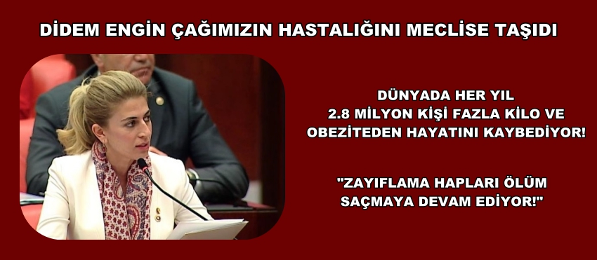 Didem ENGİN “Devlet tarafından yeterli mücadelenin gerçekleştirilememesi bilinçsizce zayıflamaya çalışan vatandaşlarımızın sağlıklarını daha da riske atan zayıflama ilaçlarına ya da yanlış diyetlere yönlenmelerine de yol açabilmektedir. ‘Zayıflama hapı’ adı altında satılan ürünlerin tanıtımı ve satışı halen kontrolsüz bir şekilde devam etmekte, vatandaşlarımızın ölümüne dahi sebep olabilmektedir” diye konuştu.