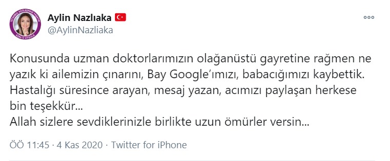 “Konusunda uzman doktorlarımızın olağanüstü gayretine rağmen ne yazık ki ailemizin çınarını, Bay Google’ımızı, babacığımızı kaybettik. Hastalığı süresince arayan, mesaj yazan, acımızı paylaşan herkese bin teşekkür…