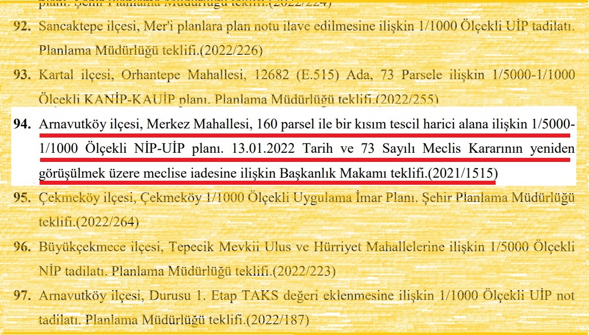 İBB Başkanı Ekrem İmamoğlu, Arnavutköy Merkez Mahallesi 160 parselle ilgili geçen ay alınan meclis kararını, “yeniden görüşülmek üzere” Meclise iade etti. İade kararı, İBB Meclisi’nin şubat ayı gündeminde yer aldı.