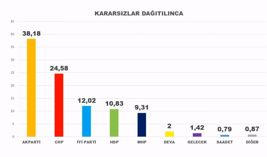 9 anketin ortalamasının kararsızlar dağıtıldığında ittifaklara olan yansıması ise Cumhur İttifakı 47,5 oy, Millet İttifakı 37,4 oy olarak hesaplandı. İttifaklarda yer almayan HDP’nin oyu 10,83 iken diğer partilerin oy oranı ise 4,27 olarak ölçüldü.