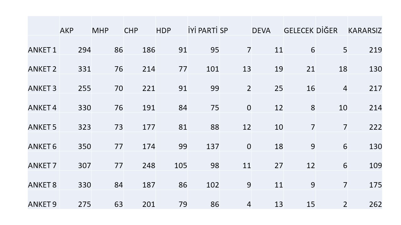 9 anketin ortalamasında kararsızlar dağıtılınca partilerin oy oranları tabloda şu şekilde yansıyor;