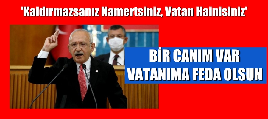 Kılıçdaroğlu, “Eğer benim dokunulmazlığımı kaldırmazsanız namertsiniz, vatan hainisiniz. Sizden mi korkacağım ben? Söyledim, yine söylüyorum. Bir canım var memleketime, bayrağıma, vatanıma feda olsun” ifadesini kullandı.