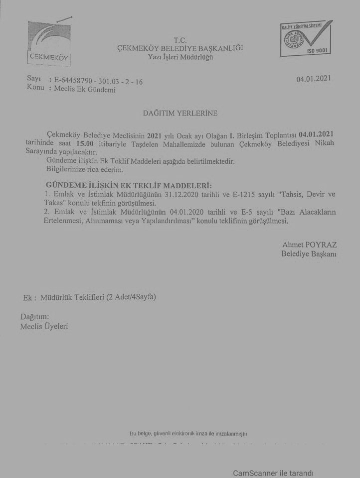İstanbul Anadolu Yakası Milli Emlak Dairesi Başkanlığı’nın, 24 Aralık 2020 tarihli Çevre ve Şehircilik Bakanlığı’na yazdığı yazıya atıf yapan Çekmeköy Belediyesi Emlak ve İstimlak Müdürlüğü, “Başkanlık Makamına” yazısında şu ifadelere yer verildi: