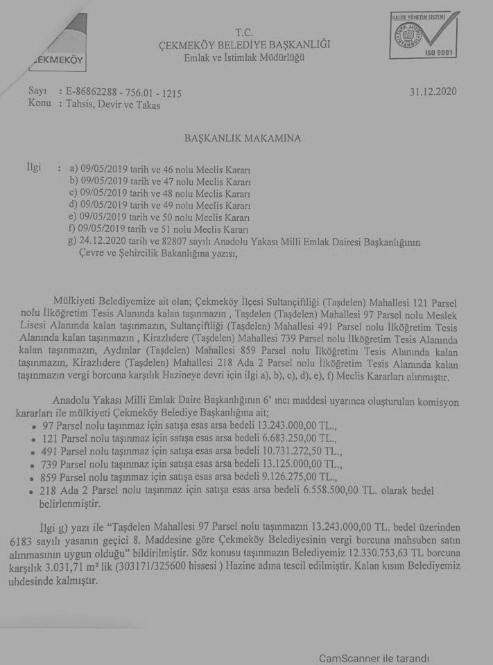 “İlgi yazı ile ‘Taşdelen Mahallesi 97 parsel no‘lu taşınmazın 13 milyon 243 bin TL bedel üzerinden 6183 sayılı yasanın geçici 8. maddesine göre Çekmeköy Belediyesi’nin vergi borcuna mahsuben satın alınmasının uygun olduğu’ bildirilmiştir. Söz konusu taşınmazın belediyemizin 12 milyon 330 bin 753 TL 63 kuruş borcuna karşılık 3.031,71 metrekarelik (303171/325600) hissesi Hazine adına tescil edilmiştir. Kalan kısım belediyemiz uhdesinde kalmıştır.”