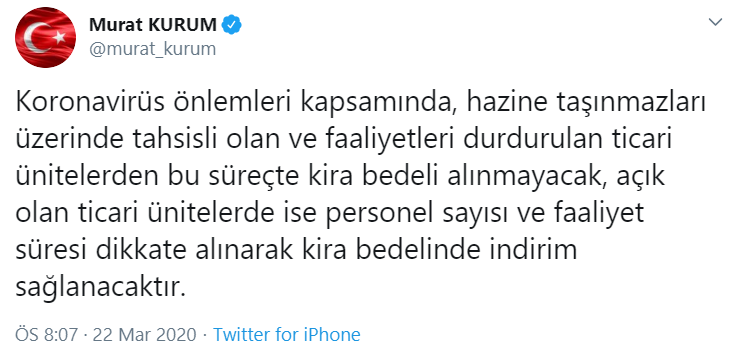Twitter hesabından açıklama yapan Kurum, hazine taşınmazları üzerinde tahsisli olan ve faaliyetleri durdurulan ticari ünitelerden bu süreçte kira bedelinin alınmayacağını açıkladı.