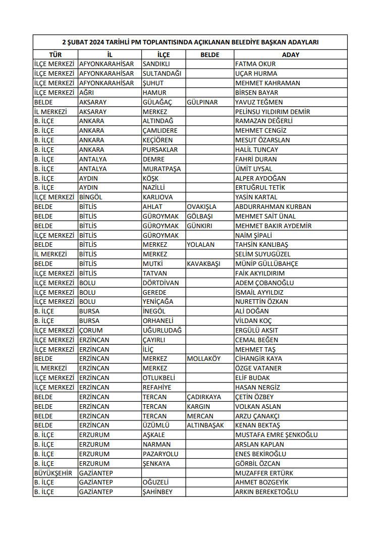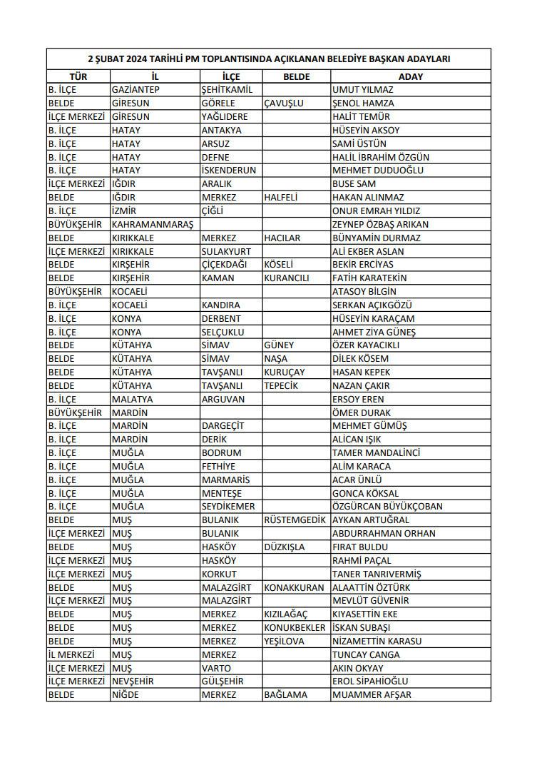 Adayların tam listesi şu şekilde: