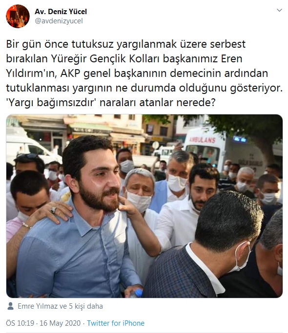 ” ‘Yargı bağımsızdır’ naraları atanlar nerede?” diyen CHP İzmir İl Başkanı Deniz Yücel’in CHP’li Eren Yıldırım’ın tutuklanmasına tepki gösterdiği açıklaması şöyle:
