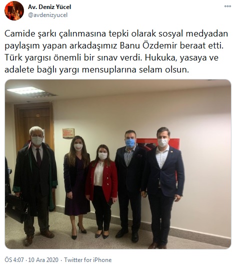 “Camide şarkı çalınmasına tepki olarak sosyal medyadan paylaşım yapan arkadaşımız Banu Özdemir beraat etti.