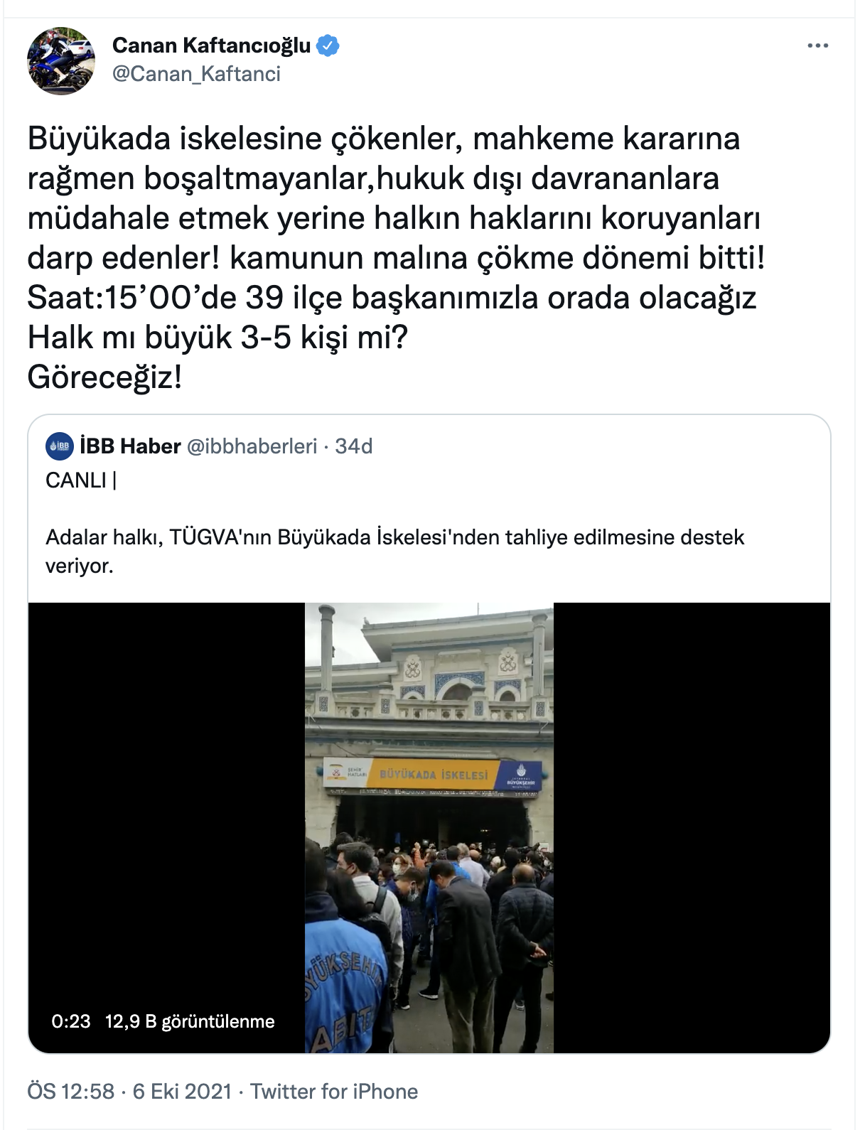 “Büyükada iskelesine çökenler, mahkeme kararına rağmen boşaltmayanlar, hukuk dışı davrananlara müdahale etmek yerine halkın haklarını koruyanları darp edenler! Kamunun malına çökme dönemi bitti! Saat: 15’00’de 39 ilçe başkanımızla orada olacağız Halk mı büyük 3-5 kişi mi? Göreceğiz!”
