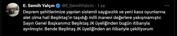 Bahçeli’nin ardından MHP Genel Başkan Yardımcısı Semih Yalçın da Beşiktaş üyeliğinden istifa ettiğini duyurdu. Yalçın, yoruma kapalı Twitter hesabından şu paylaşımı yaptı: “Deprem şehitlerimize yapılan sistemli saygısızlık ve yeni kaos oyunlarına alet olma hali Beşiktaş’ın taşıdığı milli manevi değerlere yakışmamıştır. Sayın Genel Başkanımız Beşiktaş JK üyeliğinden bugün itibarıyla ayrılmıştır. Bende Beşiktaş JK üyeliğinden an itibariyle çekiliyorum.”