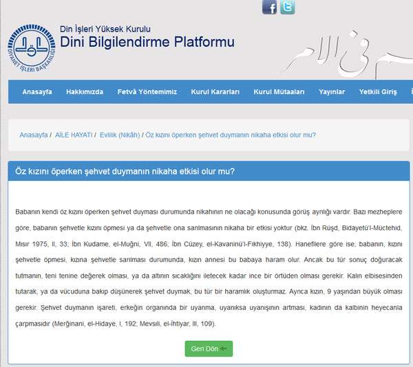 Diyanet İşleri Başkanlığı’nın resmi internet sitesindeki “Din İşleri Yüksek Kurulu Dini Bilgilendirme Platformu” dini konularla ilgili sorulara yanıt veriyor. Din İşleri Yüksek Kurulu, “Öz kızını öperken şehvet duymanın nikaha etkisi olur mu?” şeklindeki soruya ise skandal bir yanıt verdi.