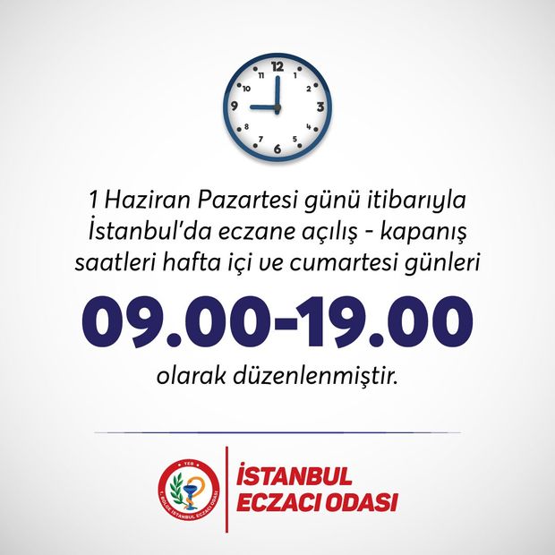 Eczane çalışma saatlerinde değişiklik! 1 Haziran’dan itibaren… İstanbul Eczacı Odası’ndan yapılan açıklamaya göre, Covid-19 pandemisi normalleşme süreci kapsamında, 1 Haziran Pazartesi günü itibarıyla İstanbul’da eczane açılış-kapanış saatleri hafta içi ve cumartesi günleri 09.00-19.00 olarak uygulanacak.