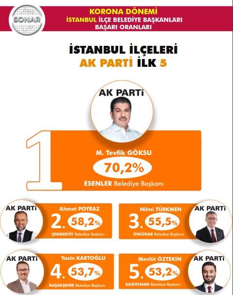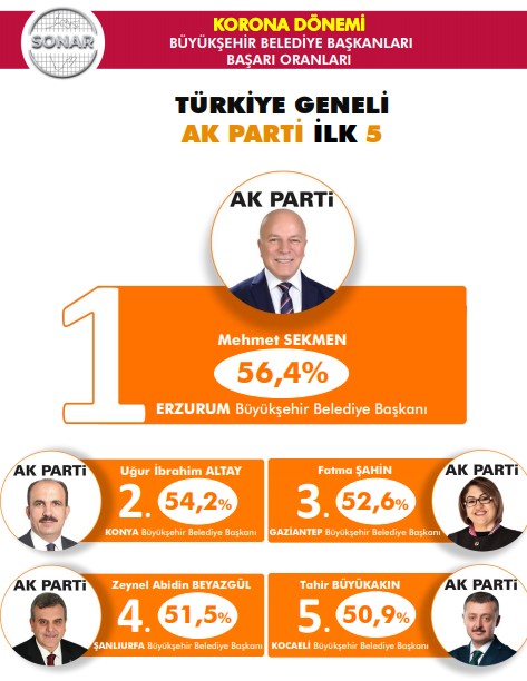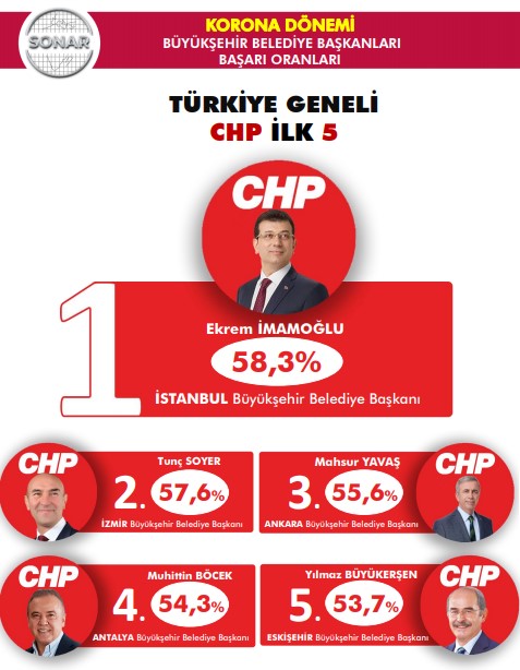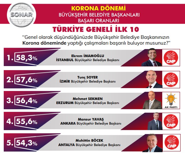 SONAR’ın anketinden çıkan sonuçlara göre koronavirüs salgını mücadelesinde en başarılı belediye başkanı İstanbul Büyükşehir Belediye Başkanı olan CHP’li Ekrem İmamoğlu olarak görüldü. İmamoğlu’nu İzmir Büyükşehir Belediye Başkanı CHP’li Tunç Soyer takip etti.
