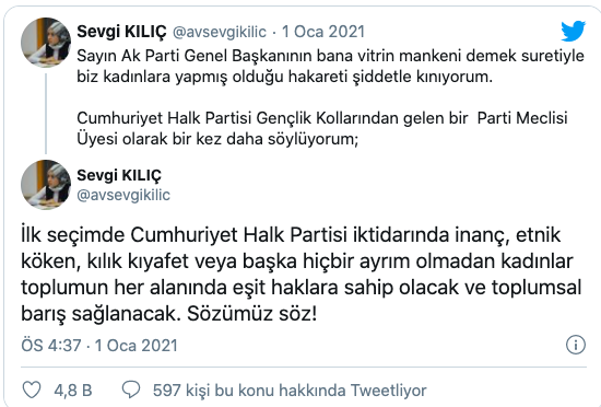 Kılıç, Twitter hesabından yaptığı açıklamada Erdoğan’a şu sözlerle seslendi: “Sayın Ak Parti Genel Başkanının bana vitrin mankeni demek suretiyle biz kadınlara yapmış olduğu hakareti şiddetle kınıyorum. Cumhuriyet Halk Partisi Gençlik Kollarından gelen bir Parti Meclisi Üyesi olarak bir kez daha söylüyorum; İlk seçimde Cumhuriyet Halk Partisi iktidarında inanç, etnik köken, kılık kıyafet veya başka hiçbir ayrım olmadan kadınlar toplumun her alanında eşit haklara sahip olacak ve toplumsal barış sağlanacak. Sözümüz söz!”
