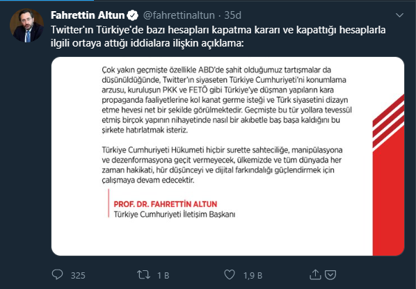 İletişim Başkanı Fahrettin Altun, Twittter’ın AKP ile bağlantılı olduğu iddiasıyla 7 bin 340 hesabı kapatmasına tepki gösterdi. Twitter’ın “sahte hesap” iddiasının gerçek dışı olduğunu kaydeden Altun, “Twitter’ın siyaseten Türkiye Cumhuriyeti’ni konumlama arzusu, kuruluşun PKK ve FETÖ gibi Türkiye’ye düşman yapıların kara propaganda faaliyetlerine kol kanat germe isteği ve Türk siyasetini dizayn etme hevesi net bir şekilde görülmektedir” diye konuştu.