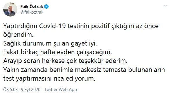 Faik Öztrak corona virüsüne yakalandı: CHP Parti Sözcüsü Faik Öztrak, sosyal medya hesabından corona virüsü testinin pozitif çıktığını duyurdu.