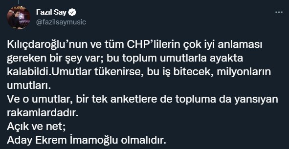 Fazıl Say, Twitter’dan yaptığı paylaşımda, “Kılıçdaroğlu’nun ve tüm CHP’lilerin çok iyi anlaması gereken bir şey var; bu toplum umutlarla ayakta kalabildi. Umutlar tükenirse, bu iş bitecek, milyonların umutları… Ve o umutlar, bir tek anketlere de topluma da yansıyan rakamlardadır. Açık ve net; aday Ekrem İmamoğlu olmalıdır” dedi.