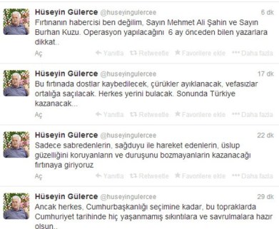 Cemaatin önemli yazarı Hüseyin Gülerce herkesi uyardı, bu uyarı ile önümüzdeki günlerde yaşanacakların bugün yaşananlardan daha sıkıntılı döneme girileceği mesajı alındı.