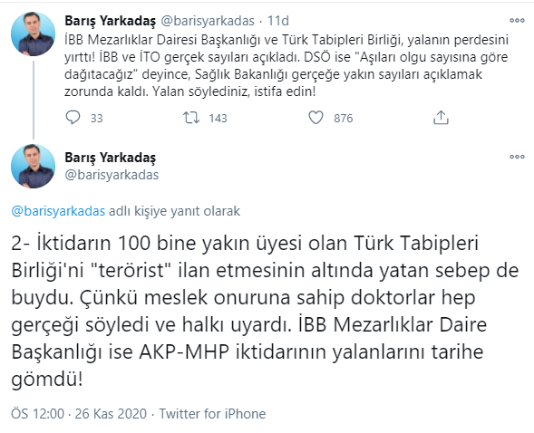 “İBB Mezarlıklar Dairesi Başkanlığı ve Türk Tabipleri Birliği, yalanın perdesini yırttı! İBB ve İTO gerçek sayıları açıkladı. DSÖ ise “Aşıları olgu sayısına göre dağıtacağız” deyince, Sağlık Bakanlığı gerçeğe yakın sayıları açıklamak zorunda kaldı. Halka yalan söylediniz, istifa edin!
