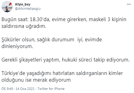 Kimliği belirsiz gruplarla gerçekleştirilen saldırıların ilk hedefi KRT TV programcısı Avukat Afşin Hatipoğlu oldu. Akşam üzeri evine girmek üzereyken maskeli kişilerce saldırıya uğradığını söyleyen Hatipoğlu, “Şükürler olsun, sağlık durumum iyi, evimde dinleniyorum. Gerekli şikayetleri yaptım, hukuki süreci takip ediyorum. Türkiye’de yaşadığımı hatırlatan saldırganların kimler olduğunu ise merak ediyorum” dedi. Hatipoğlu’na saldıran kişilerin kaçarken, “Konuştuklarına dikkat et” dediği öğrenildi.