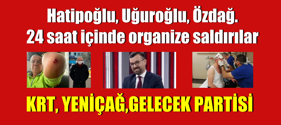 Türkiye’de 24 saat içinde üç ayrı muhalif isme yönelik saldırı yaşandı. KRT TV programcısı Avukat Afşin Hatipoğlu, Gelecek Partisi Genel Başkan Yardımcısı Selçuk Özdağ ve Yeniçağ Gazetesi Ankara Temsilcisi Orhan Uğuroğlu kimliği belirsiz gruplarca yapılan saldırıların hedefi oldu. Olayla ilgili 3 kişinin gözaltına alındığı öğrenilirken, Özdağ’a saldıranlarla Uğuroğlu’na saldıranların aynı kişiler olduğu iddia edildi.