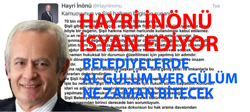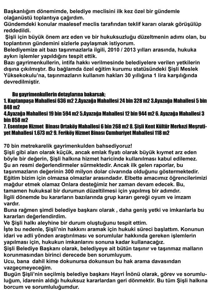 CHP Şişli Belediyesi Mustafa Sarıgül zamanında meclis kararı ile yapmış olduğu devir işlemlerini gözden geçiriyor. Mustafa Sarıgül, Bugün Şişli Belediye Başkanı olan Hayri İnönü’nünde içinde bulunduğu CHP meclis grubunda alınmış olduğu kararla, Ayazağada bulunan arsaların Şişli Meslek Yüksek Okuluna 30 yıllığına ve 1 ₺ karşılından devrinin Meclis görüşmelerinden Hayri İnönü grup kararı olduğu için mecburen onay verdim açıklaması yaptı.