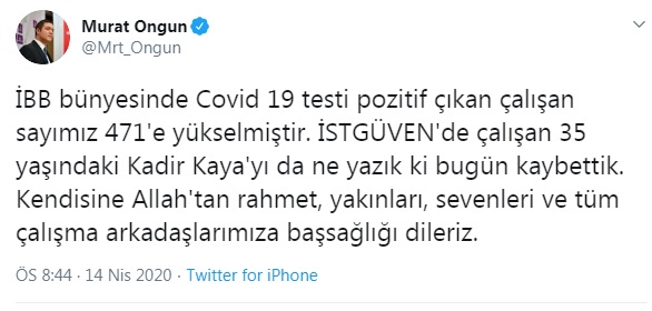 İBB Sözcüsü Murat Ongun, Twitter üzerinden yaptığı açıklamada 471 çalışanda Koronavirüs tespit edildiğini aktardı.Kadir Kaya isimli İBB işçisinin de yaşamını yitirdiği bilgisini veren Ongun, baş sağlığı diledi.