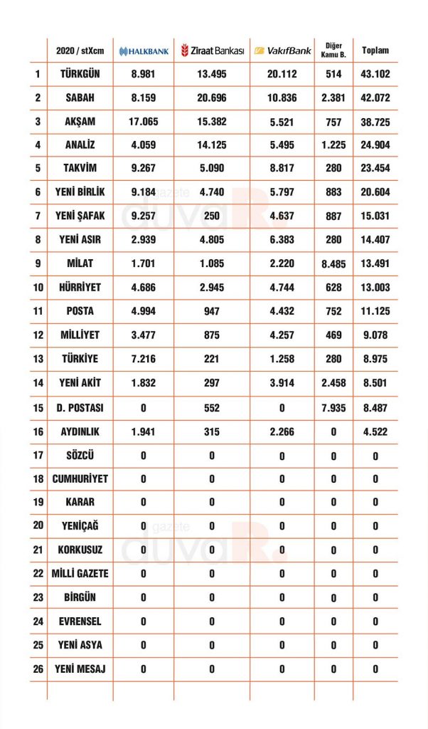 Kamu bankalarının gazete ve televizyonlara ilan dağıtımını rakamlarla sıralayan CHP’li Çakırözer, “İşte gazeteci Kenan Şener ortaya çıkardı. 2020 yılında Halkbank, Ziraat Bankası, Vakıfbank ve kamu katılım bankalarından gazetelere toplam 300 bin sütun santim ilan verilmiş. En üstte Türkgün, Sabah, Akşam var. 10’uncu sırada Hürriyet, Posta. Listenin altı var, sıfırlarla dolu! Sözcü var, ne kadar sıfır! Cumhuriyet, Karar, Yeniçağ, Korkusuz, Millî Gazete, Birgün, Evrensel, Yeni Asya, Yeni Mesaj, hepsi sıfır! Tek kuruş ilan yok” diye konuştu.
