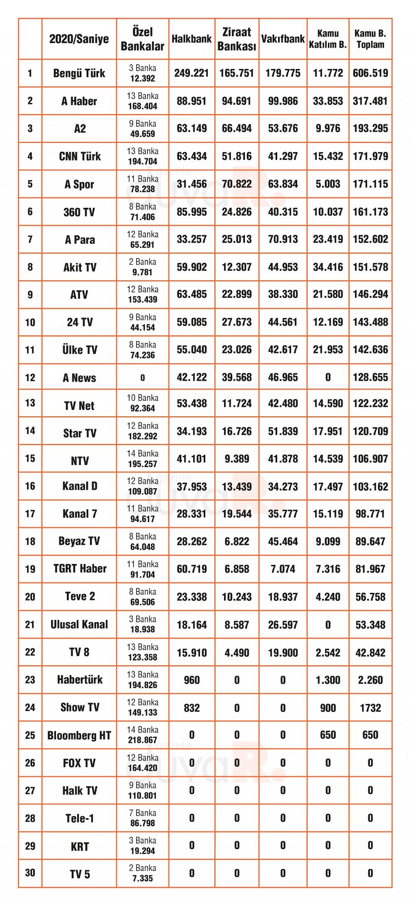 Kamu bankalarından televizyon kanallarına aktarılan ilanları da sıralayan Çakırözer, “Kamu bankalarından televizyonlara toplam 3 milyon 367 bin saniye verilmiş. 1’inci sırada Bengütürk TV var; 606 bin saniye. İlanların yaklaşık yüzde 18’i ona verilmiş. A Haber 317 bin saniye ile yüzde 10 almış. Akit TV 8’inci, NTV 15’inci, Kanal D 16’ncı sırada, Habertürk, Show TV 23, 24’üncü sırada. Her birine 2 bin saniye verilmiş, Bengütürk’ün üç yüzde 1’i, A Haber’in yüz ellide 1’i kadar. Bir de alttaki sıfırlar var. FOX TV, Halk TV, Tele 1, KRT, TV5 sıfır, tek kuruş reklam alamamış televizyonlar” dedi.