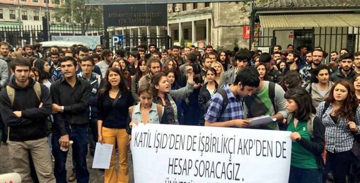 Polis bu kez saldırganlara biber gazıyla müdahale ederken, Edebiyat Fakültesi’nin bahçesinde toplanan öğrenciler ‘Katil IŞİD üniversiteden defol’ ve ‘IŞİD vuruyor AKP koruyor’ sloganlarıyla saldırıyı protesto etti