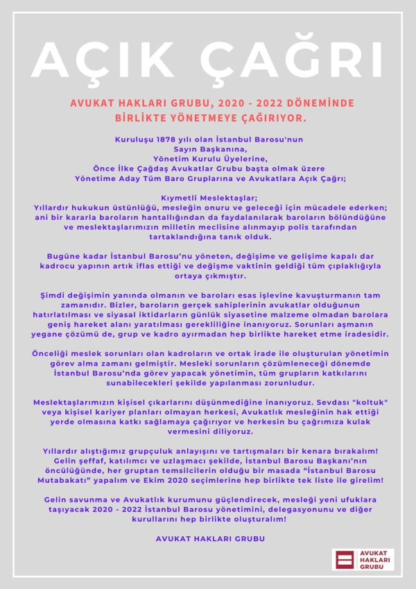 2016’dan bu yana İstanbul Barosu seçimlerinde yarışan ve öncelikli meselesini Avukat Hakları olarak belirleyen Avukat Hakları Grubu[1], İstanbul’daki tüm avukatlara ve baro seçim gruplarına açık bir çağrı yaptı. Tarihi nitelikteki bu çağrıda: yıllardır hukukun üstünlüğü, mesleğin onuru ve geleceği için mücadele edilirken; ani bir kararla baroların bölündüğüne, avukatların ve baro başkanlarının TBMM’ye alınmamasına, polis tarafından tartaklandığına dikkat çekilerek, bugüne kadar İstanbul Barosu’nun, değişime ve gelişime kapalı dar kadrocu sisteminin iflas ettiği ve değişme vaktinin geldiği vurgulandı.