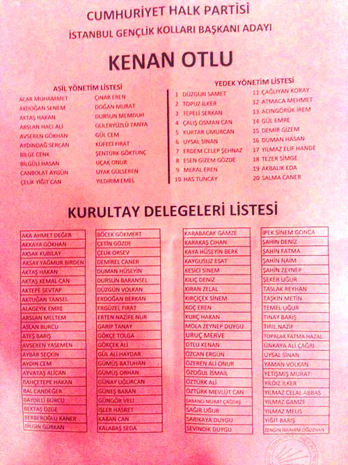 Seçim blok listeyle yapılırken Kongre Divan Başkanı Efkan Bolaç oldu. Kongreyi 140 oy alan Ozan Işık karşısında 154 oy alan Kenan Otlu kazandı. Buna göre CHP İstanbul İl Gençlik Kolları’nın yeni başkanı Kenan Otlu oldu.