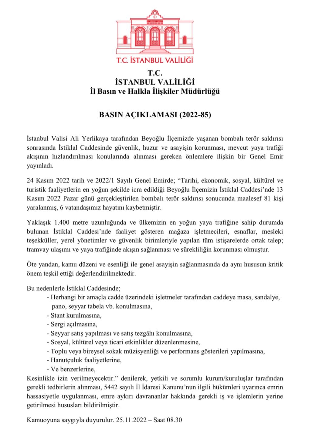 İstiklal Caddesi’nde saksıların kaldırılmasından sonra yeni yasaklar getirildi. Valilik genelgesinde; İstiklal Caddesi’nde sokak müzisyenliğinin yapılması, caddeye masa ve sandalyelerin konulması, stand kurulması, sosyal ve kültürel faaliyetler, seyyar satış yapılması yasaklandı.