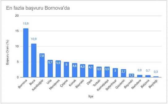 İzmir’deki İmar Barışı başvurularının en yoğun olduğu ilçe yüzde 15.9’la Bornova oldu. Buca yüzde 10.9’la ikinci, Karabağlar ise yüzde 7.8’le üçüncü sırada yer aldı. Başvuruların yüzde 4.3’ü, yani yaklaşık 34 bin başvuru depremin en ağır hasar verdiği Bayraklı ilçesinde gerçekleşti. Ağır hasar alan bir başka ilçe olan Seferihisar’da ise yüzde 3 oranla yaklaşık 24 bin başvuru oldu. İzmir’de ilçelere göre imar barışı başvuru oranları şöyle: