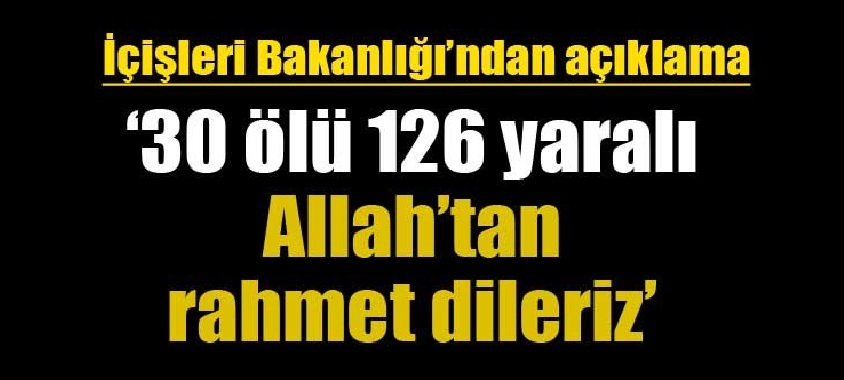 Patlama sonucunda ilk belirlemelere göre 30 vatandaşımızın hayatını kaybettiği, 126 vatandaşımızın ise yaralandığı değerlendirilmektedir. Yaralıların tedavileri çeşitli hastanelerde devam etmektedir.