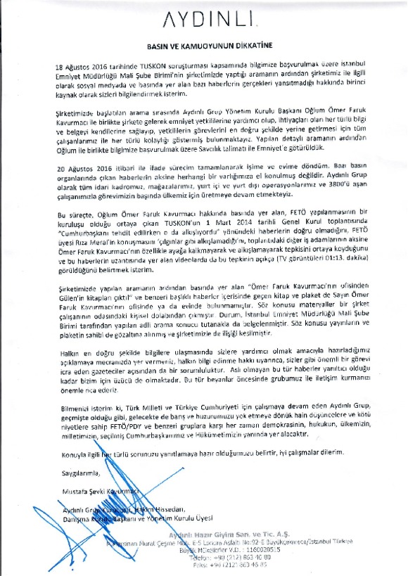 Ömer Faruk Kavurmacı’nın halen gözaltında olduğu bugünlerde şirket adına yapılan açıklamada bu terör örgütü ile hiç bir ilişkileri olmadığını, Tuskon genel kurulununda konuşmacıları alkışlama veya ayağa kalkmama gibi durumlar yaşanmadığını belirtti.